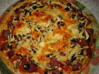Насмотрелась я в блоге у оли Фиалки на вкуснейшие кексики, что самой жуть как захотелось что-нибудь испечь! Но, когда у своих домочадцев спросила, чего они хотят, все в один голос закричали: Пиццу!!! Так что мой кексно-пирожковый порыв был прибит накорню. Пришлось идти, месить тесто, резать начинку. О, как я это люблю!!! Хоть и времени тратишь порядочно, но зато потом так вкуууусно!!!А вот и наша пиццулька(пообще-то их было 2, но первая в кадр не попала)
