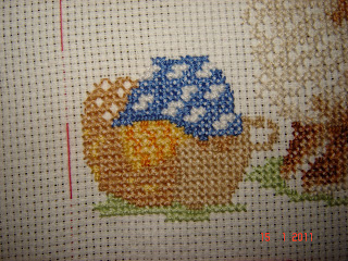 Я, когда распечатала схему сначала и не посмотрела, что он из себя представляет, а уже, когда тряпочку с робином получила, в пяльцы её затянула, решила детально всё-привсё рассмотреть, как полагается. И, О УЖАС!!!!!!! - половина схемы-петиты. Я, конечно, такие крестики уже вышивала, но не в таком колличестве!!! Вот маленький кусочек этого чуда. И на этом кусманчике размером 30х20 крестиков дружно выстроились 146 петитов. и это-не самый сложный кусочек!!!